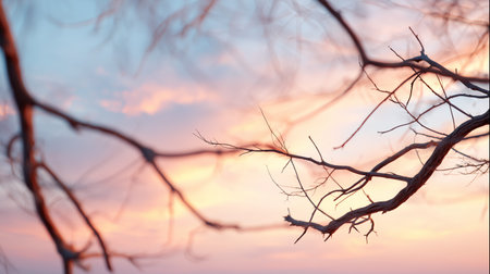 A beautiful representation of winter with a delicate branch against a soft blue sky, accented by subtle pink hues, capturing tranquility and minimalism.