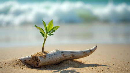 Delicate green sprout on weathered driftwood by the seashore