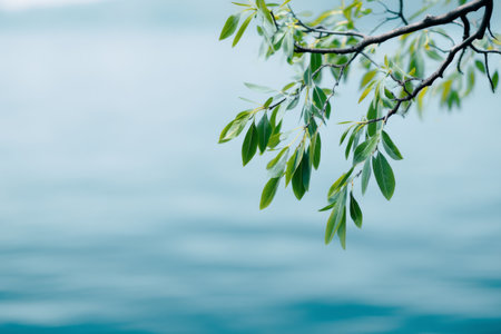 Green leaves gently sway above calm blue waters in peaceful natural setting during daylight