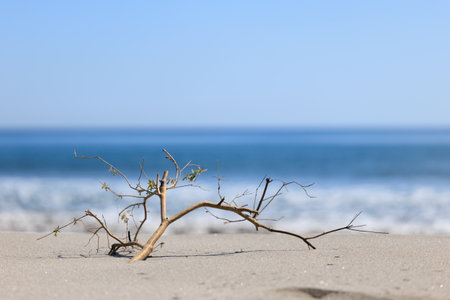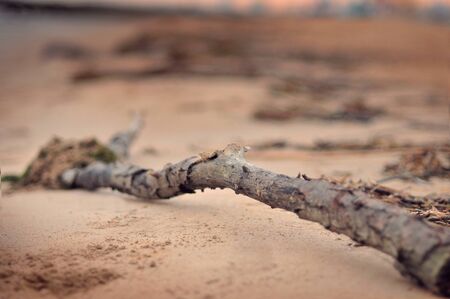 Dry tree branch on sandy beach, outdoor day light, nature background
