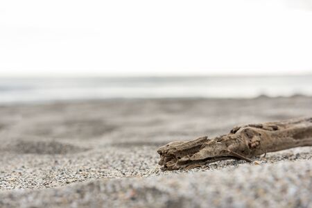 Dry driftwood on the beach in cloudy weather. Selective focus.