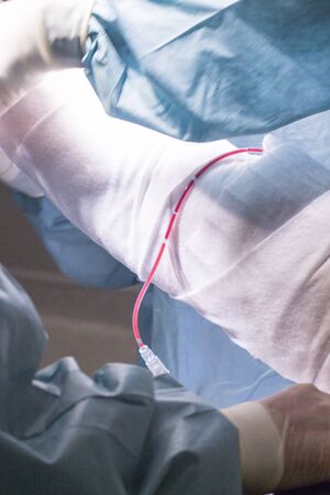 Nurse bandaging after Surgical operation knee arthroscopy micro surgery in hospital operating theatre emergency room for orthopedics.