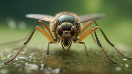 A mosquito is captured feeding, revealing its striking features and colors. The close-up highlights the delicate structure of its body and large, colorful eyes.