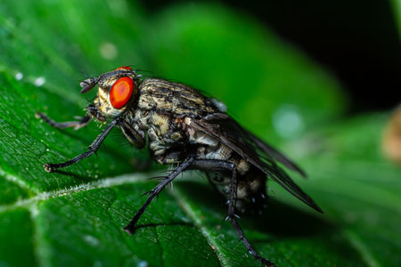 A fly positioned on a green leaf showcases its detailed body structure and striking red eyes, surrounded by lush greenery in a natural habitat.