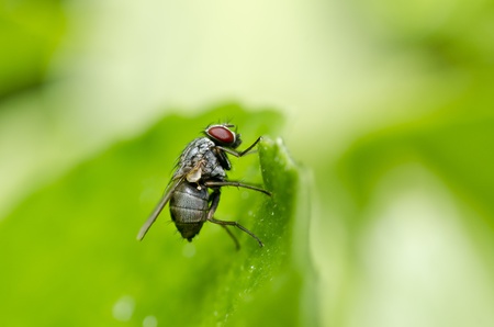 Macro Photography of Housefly is Sucking Fruit on Green Leaf