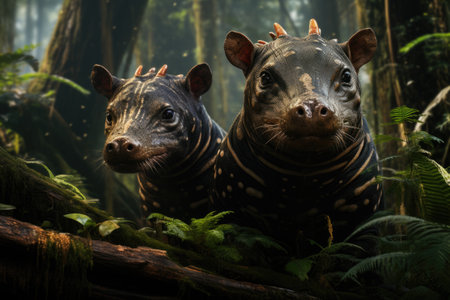 Two hippos in the rainforest. Wildlife scene from nature.