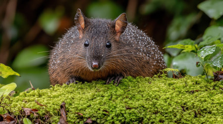 This image showcases a small, cute mammal perched on a moss-covered log in a vibrant forest. It captures the beauty of wildlife in a serene setting.
