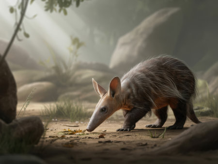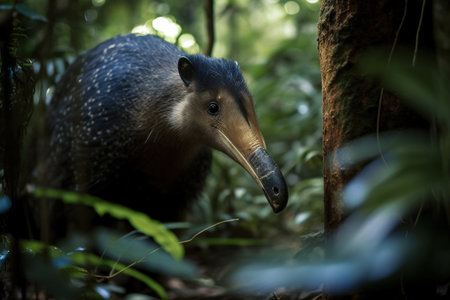 A detailed AI-generated image depicts an aardvark with its long snout sniffing the ground amidst lush green foliage and soft dappled light in a mysterious forest environment.