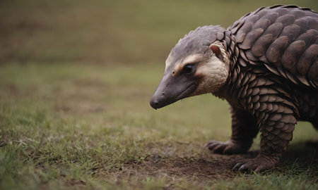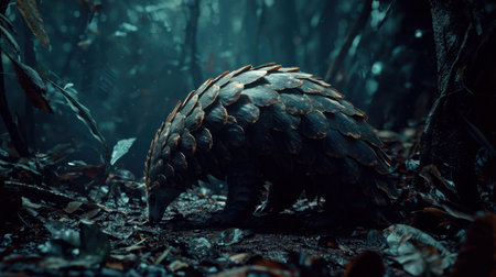 A pangolin in misty forest, surrounded by leaves and dim light, creating serene atmosphere