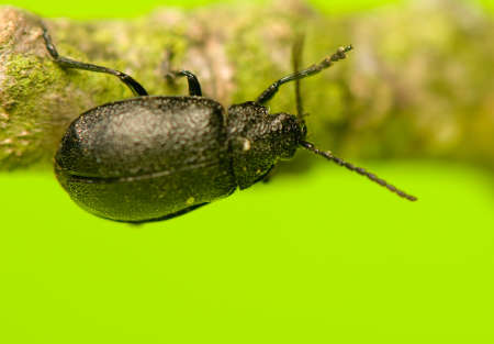 Black beetle perched on vibrant leaves, showcasing intricate details and textures. Nature and entomology concept with green background.