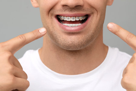 Close up of smiling woman licking white straight teeth with orthodontic brackets. Patient demonstrating results of dental braces treatment. Concept of dentistry, dental care and orthodontic treatment.