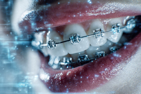 A cheerful smile showing casing pristine teeth with sleek metallic braces, illuminated by vibrant blue digital accents that highlight cutting-edge dental technology advanceme