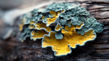 Vibrant yellow and green lichen grows on weathered wood, showcasing intricate natural patterns. The macro detail highlights the beauty of this symbiotic organism.