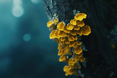 This stunning image captures vibrant yellow fungi growing on a dark wood log in a serene forest setting, showcasing the beauty of nature and biodiversity.