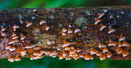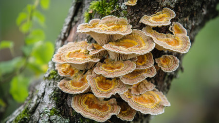 Colorful mushrooms on tree bark in a vibrant forest enhance the beauty of this habitat