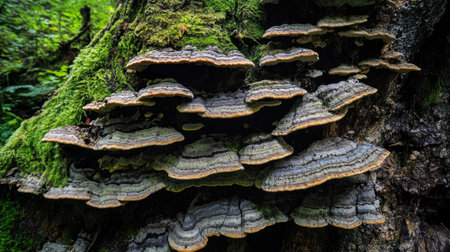 Close-up of layered shelf fungi attached to tree trunk, symbolizing forest life, decomposition, and biodiversity