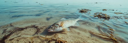 A dead fish lies on the shore, surrounded by plastic debris and oil spills, illustrating the severe impact of pollution on marine life.