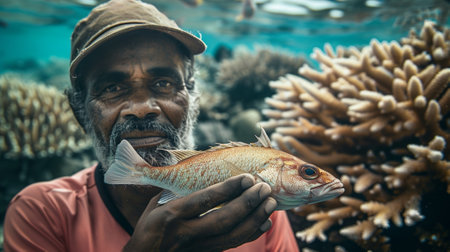An image of a fisherman holding a fish in front of a beautiful coral reef encouraging viewers to protect the diverse and fragile ocean ecosystems by practicing sustainable fishing ods.