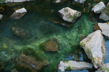 Lush green algae and moss-covered rocks in clear, tranquil water, showcasing natures serene aquatic beauty.