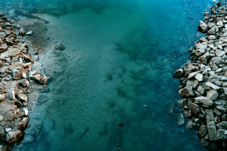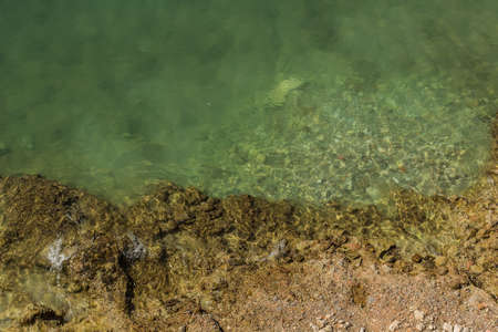 green sea water surface with waves and stones shore aerial shot from above, copy space for your text here