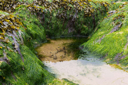 Nature's artistry: rugged coastal rocks adorned with lush green algae meet the serene waters of the ocean, creating a captivating natural scene and texture.