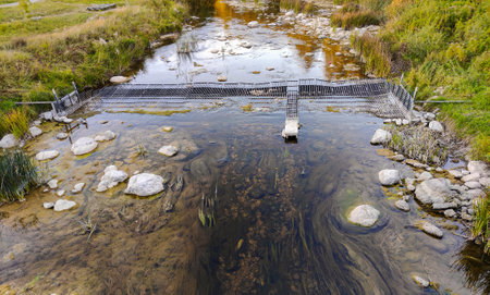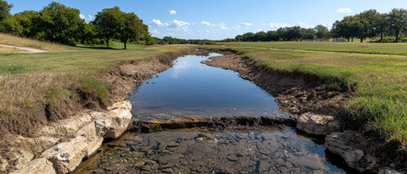 A close-up view of a freshwater stream gently flowing through vibrant green grass, capturing the essence of tranquility in a bright outdoor setting.