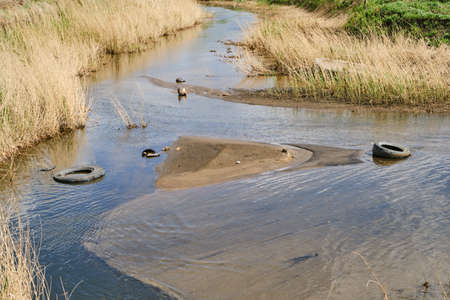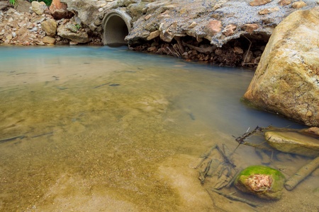 Contaminated water concept, Dirty water flows from the pipe into the river, Water pollution, environment contamination.