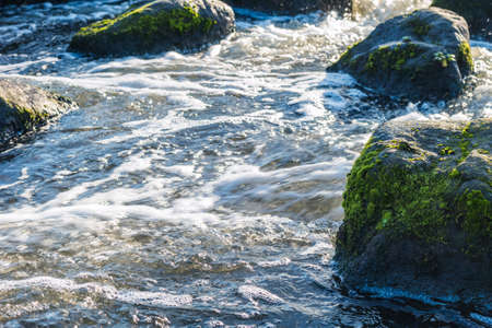 Mountain river, rushing water, flowing river water, clear mountain stream, dark toned