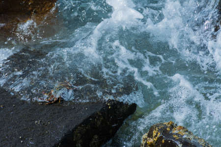 Close-up of water splashes against the breakwaters on the Balearic Sea. View from the pier on the beach of Barcelona, Spain.