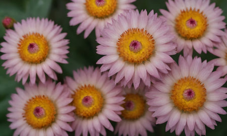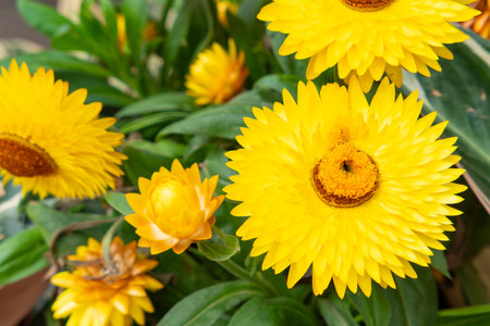 A closeup of straw flower or helichrysum bracteatum flowers on blurred background. Selective focus