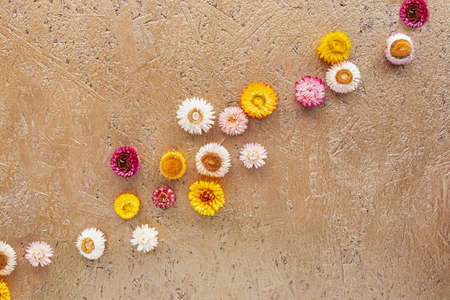 Grouping colorful strawflowers, also known as Helichrysum, and green leaves on a light wooden background