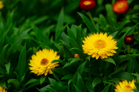 Red and yellow flowers on a background of green foliage. Helichrysum orientale. Beautiful bright flowers and background blur.