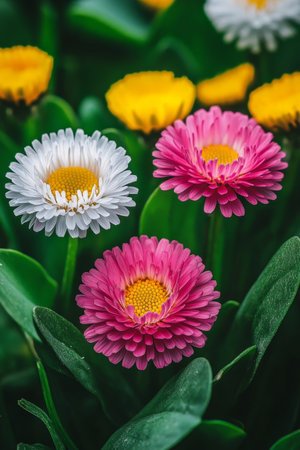 Close-up of Vibrant Pink, White, Yellow Daisy Flowers Blooming in Garden, Natural Daylight