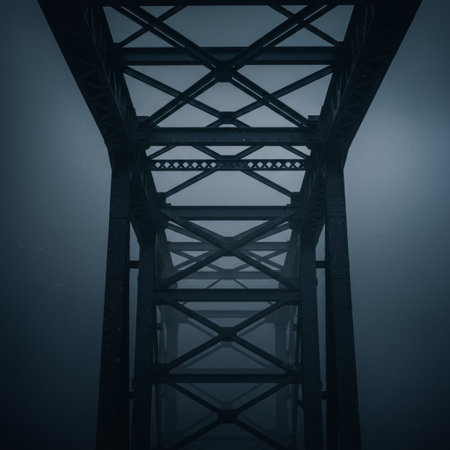 An intricate view from beneath a steel bridge, highlighting the structural details, rivets, and soft lighting. Ideal for industrial design and architecture themes.