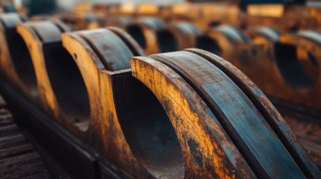 A close-up view of rusty metal cross-sections from industrial machinery components, showcasing intricate details and textures in warm dim lighting.