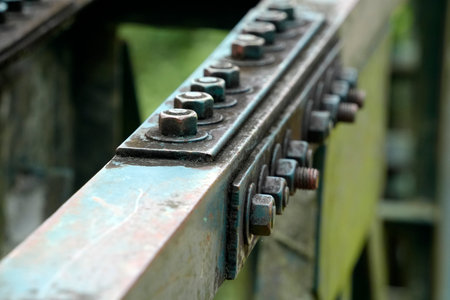 Close-up image of rusty bolts on metal beams showcasing intricate details of corrosion and weathered textures in an industrial setting.