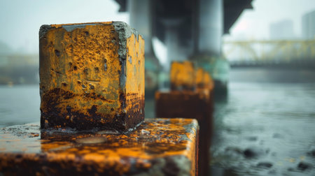 Close-up of a corroded, rusty metal post on a riverbank, with a foggy backdrop and bridge silhouette.