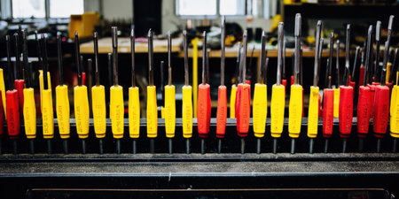 Screwdrivers with red and yellow handles standing neatly in a specialized holder, presenting tools for professional repair, craft, and maintenance work in a workshop environment