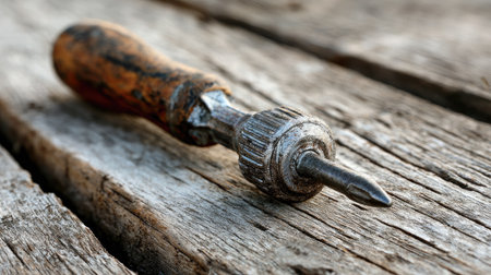 A rustic vintage screwdriver featuring a wooden handle, gracefully resting on a weathered wooden surface. Perfect for showcasing DIY and repair themes.