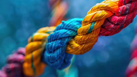 Intertwined ropes of diverse colors symbolize unity and synergy in teamwork, forming a strong, cohesive bond.