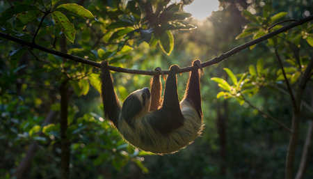 Peaceful sloth dangles from a branch, its slow movements reflecting serene jungle life, Ai Generated.