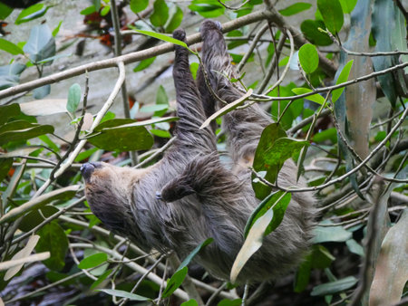 Brown fluffy sloth sleeping while hanging on tree branch in zoo