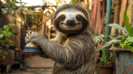 Sloth proudly holding a trophy, raising its arm in victory