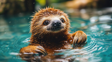 A cute sloth is captured mid-swim, its fur glistening as it gazes directly at the camera. The image showcases the sloths unique features and the serene water environment.