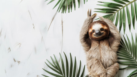 Cute Sloth on Fight Procrastination Day with Monstera Leaf on White Background
