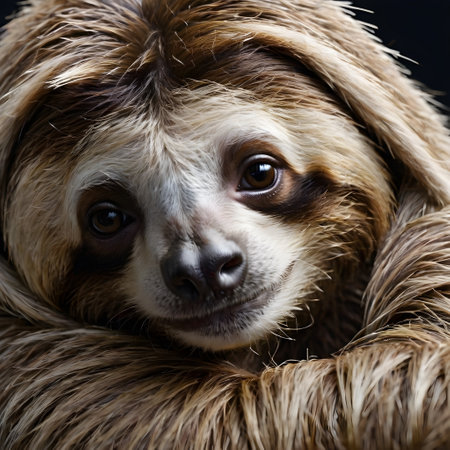 A detailed close view of a sloth face with brown eyes, furry textures, and a peaceful expression that reveals its calm nature