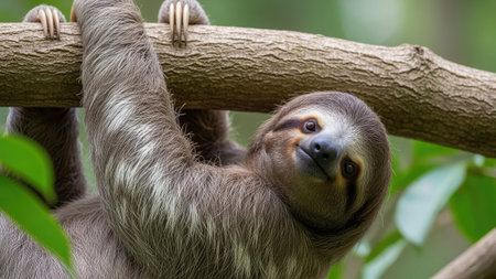 A sloth is suspended from a tree branch, its long claws gripping tightly. It looks relaxed and slow-moving, characteristic of their arboreal lifestyle. The sloths fur is a grayish-brown color, blending in with the tree bark.