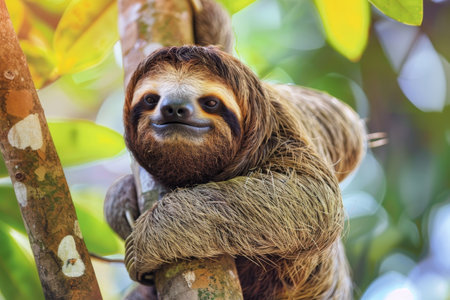 Enchanting three-toed sloth adorns a jungle branch, exuding tranquility amidst the verdant surroundings. Its sleepy eyes and gentle smile invite a sense of peace and harmony.