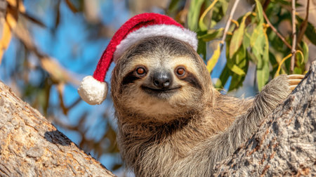A close-up of a sloth with a red and white Santa hat on its head, perched in a tree with green leaves.