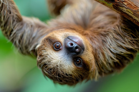 Sloth hanging upside down, looking directly at the viewer with curious eyes
